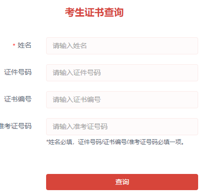 *姓名必填,证件号码/证书编号/准考证号码必填一项。